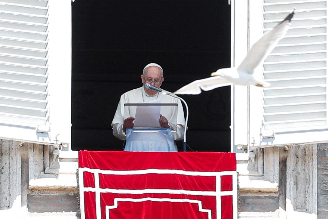 A seagull flies next to Pope Francis as he speaks during Regina Caeli prayer, in Saint Peter’s square at the Vatican, April 24, 2022. REUTERS/Remo Casilli