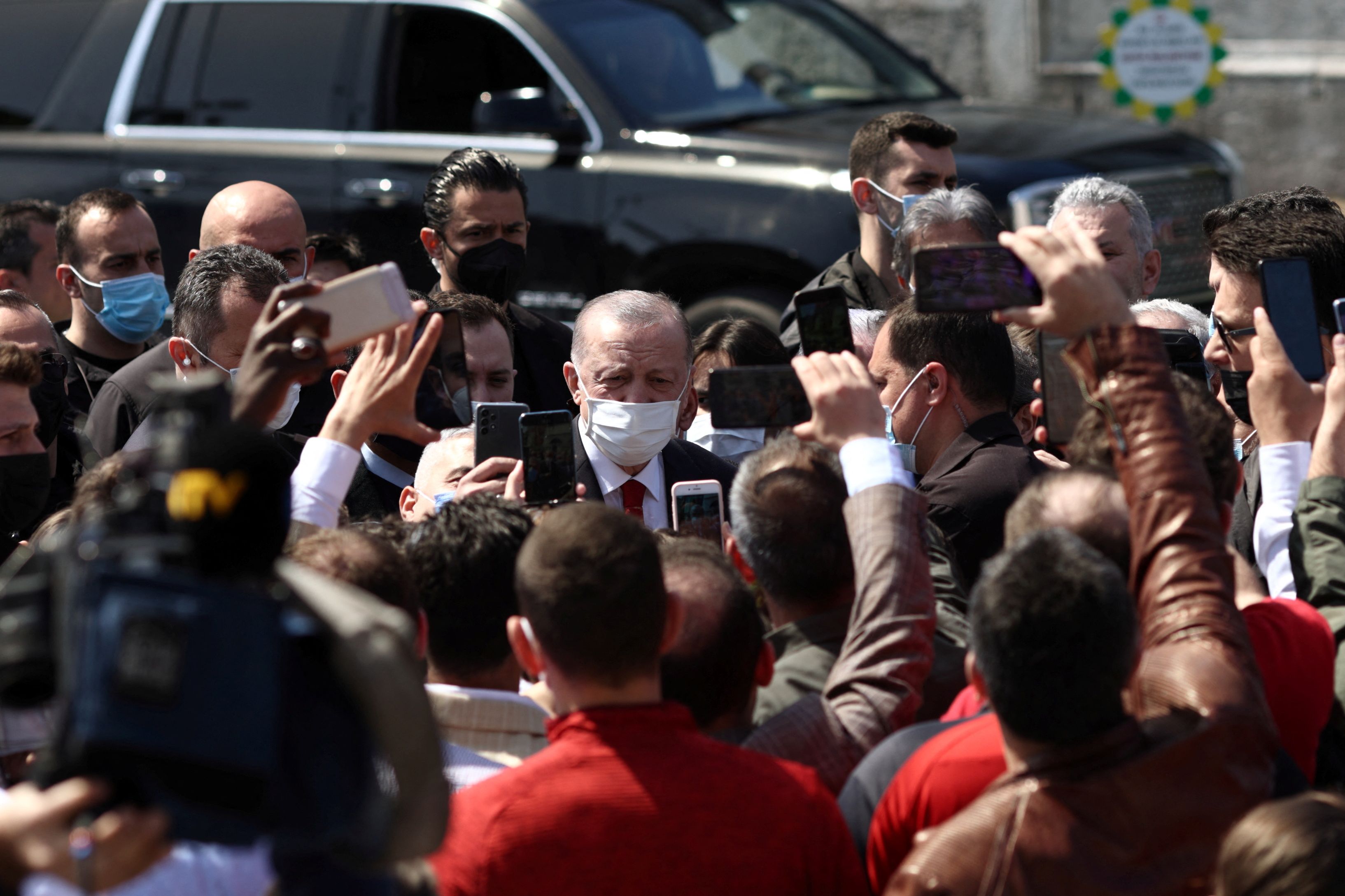 Turkish President Tayyip Erdogan greets people after attending the Friday prayers at Ayasofya-i Kebir Camii or Hagia Sophia Grand Mosque in Istanbul, Turkey April 15, 2022. REUTERS/Murad Sezer