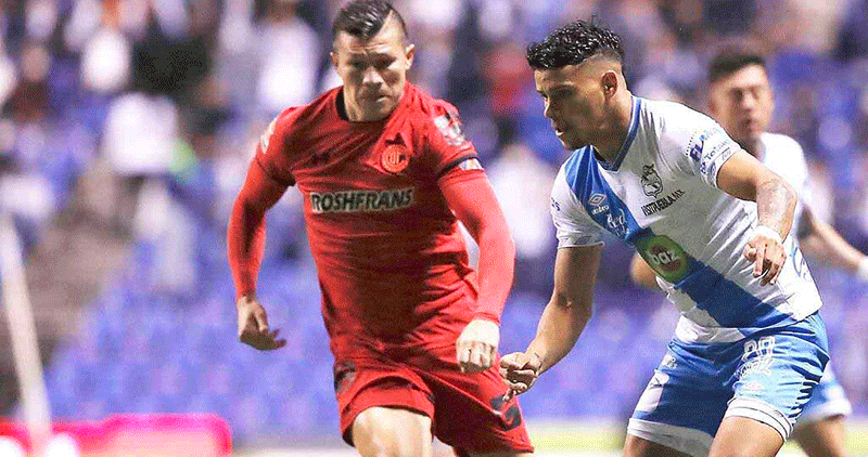 (L-R), Javier Salas of Puebla and Kevin Castaneda of Toluca during the game Toluca vs Puebla, corresponding to day 12 of the Torneo Clausura Grita Mexico C22 of Liga BBVA MX, at Nemesio Diez Stadium, on April 03, 2022.