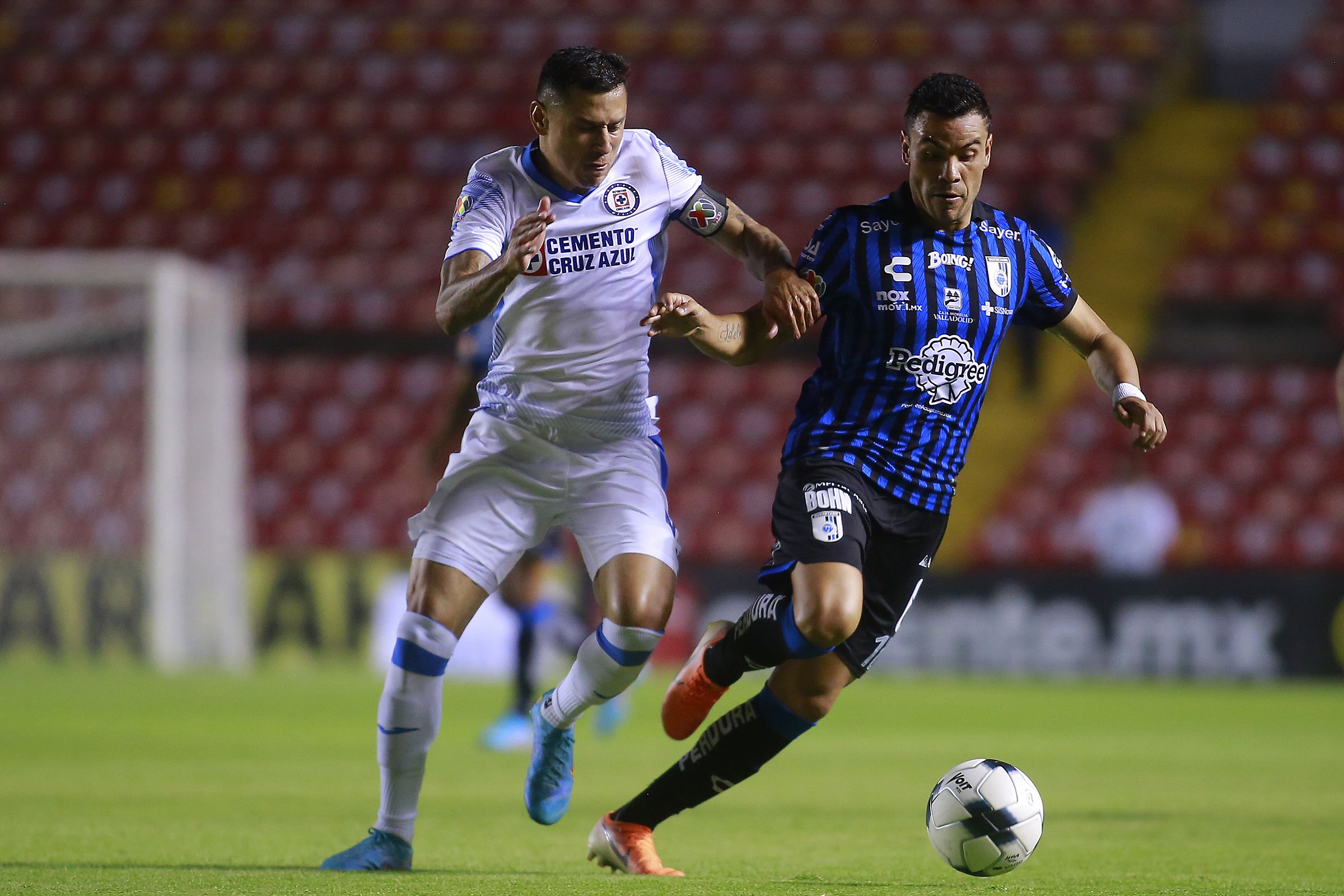 MEX1520. QUERÉTARO (MÉXICO) 21/04/2022.- Julio César Domínguez (i) de Cruz Azul disputa el balón con Pablo Barrera (d) de Querétaro durante un partido por la jornada 15 del torneo Clausura 2022 de la Liga MX, en el estadio La Corregidora de Querétaro (México). EFE/Víctor Cruz
