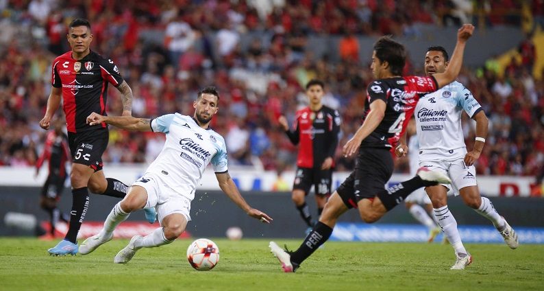 AME1411. GUADALAJARA (MÉXICO), 14/04/2022.- José Abella (d) de Atlas disputa el balón con Gonzalo Sosa (i) de Mazatlán hoy, durante un partido por la jornada 14 torneo clausura 2022 del fútbol mexicano, en el Estadio Jalisco, en Guadalajara (México). EFE/ Francisco Guasco