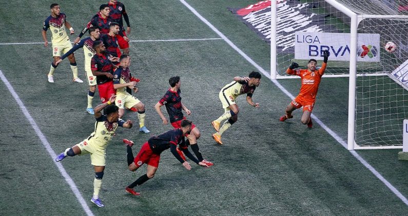 MEX1155. TIJUANA (MÉXICO) 15/04/2022.- Facundo Ferreyra (centro-abajo) de Tijuana anota un autogol ante el América, durante un juego de la jornada 14 de la Liga MX del futbol mexicano hoy, celebrado en el estadio Caliente de la ciudad de Tijuana, estado de Baja California (México). EFE/Alejandro Zepeda