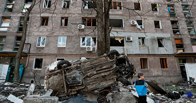 A boy stands next to a wrecked vehicle in front of an apartment building damaged during Ukraine-Russia conflict in the southern port city of Mariupol, Ukraine April 24, 2022. REUTERS/Alexander Ermochenko