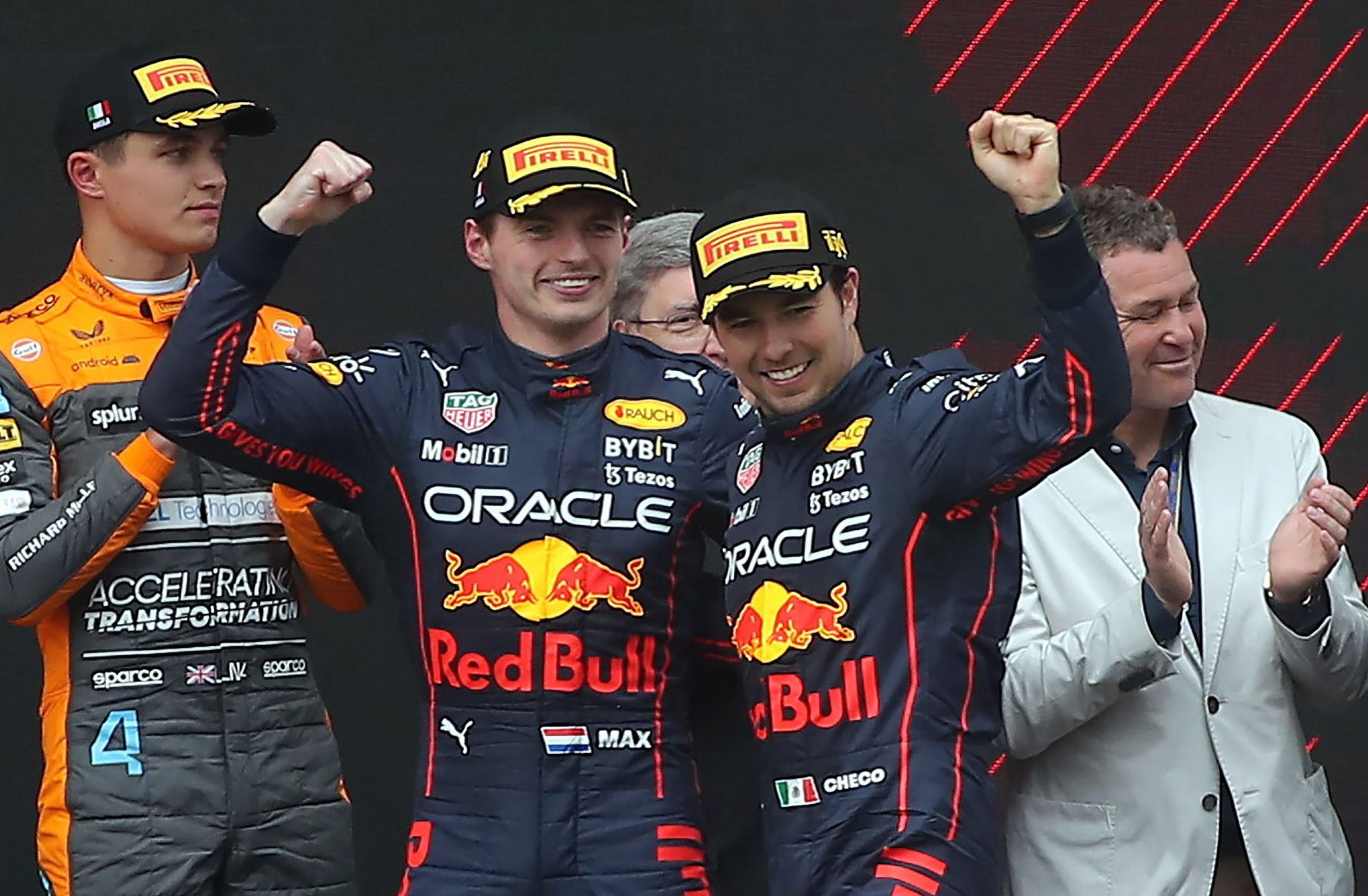 Imola (Italy), 24/04/2022.- Winner Red Bull Racing’s Dutch driver Max Verstappen (CL) and second placed Red Bull Racing’s Mexican driver Sergio Perez (CR) celebrate on the podium for the Formula One Grand Prix of Emilia Romagna at the Autodromo Internazionale Enzo e Dino Ferrari race track in Imola, Italy, 24 April 2022. (Fórmula Uno, Italia) EFE/EPA/SANNA